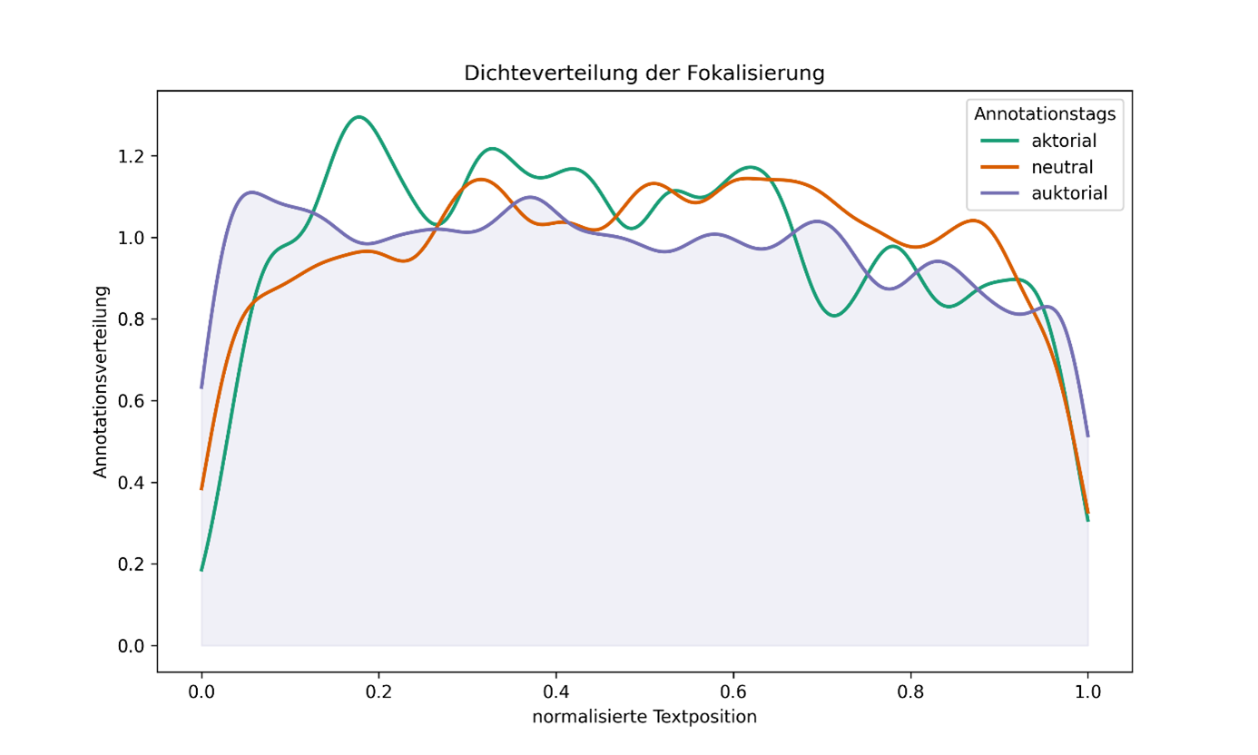 - Abb. 4: Dichteverteilung der annotierten Erzählperspektiven über den normalisierten Textverlauf der Fallgeschichten hinweg. Die horizontale Achse markiert die Textposition, die vertikale Achse die Dichte der Annotationen. [Grafik: Herget / Weitin 2025]