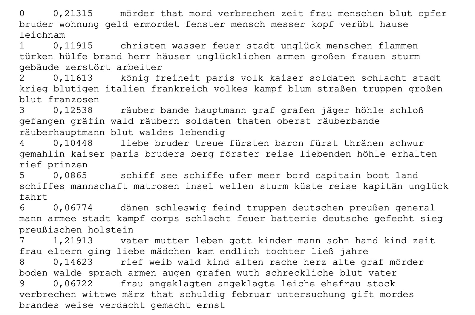 [13]Bevor Topic Modeling-Programme ihre Rechenoperationen ausführen können, müssen die menschlichen Benutzer*innen dem Programm eine Reihe von Vorgaben machen. Diese Festlegungen haben einen Einfluss auf das Ergebnis, also darauf, wie das Programm topics modelliert und wie plausibel diese erscheinen. Die wichtigste Vorgabe ist die Anzahl der topics, die für ein Textkorpus angenommen wird. Da diese Variable unbekannt ist, muss hier mit verschiedenen Einstellungen experimentiert werden. Ist die vorgegebene Anzahl zu niedrig, dann findet das Programm nur sehr ›vage‹ Themen. Ist sie zu hoch, dann nähern sich die topics bei der Analyse eines Textkorpus einzelnen Texten an. Jeder Einzeltext erscheint dann als eigenes topic, was nicht im Sinne der Analyse ist, in der es ja um den Nachweis textübergreifender Themen geht. Festzulegen sind vor den Rechenoperationen zudem die Anzahl der Wörter, die ein topic konstituieren (sollen), sowie die Anzahl der Wiederholungen (Iterationen), die das Programm durchläuft, bevor es sich auf ein Ergebnis festlegt. Dieses Ergebnis besteht dann in der Regel aus (a) einem Überblick über die (zuvor festgelegte Anzahl von) topics, die im Korpus enthalten sind und die Wörter, die sie konstituieren, mitsamt einem Zahlenwert, der den ungefähren Anteil dieses topics im Korpus beziffert (Abbildung 3); (b) einem Überblick über die einzelnen Texte des Korpus, mitsamt einem Zahlenwert, der die Wahrscheinlichkeit beziffert, dass ein topic in einem bestimmten Text enthalten ist. Letzteres relationiert also alle Texte eines Korpus mit allen topics – sodass auch die Mischungen verschiedener topics in einzelnen Texten sichtbar werden (Tabelle 1).