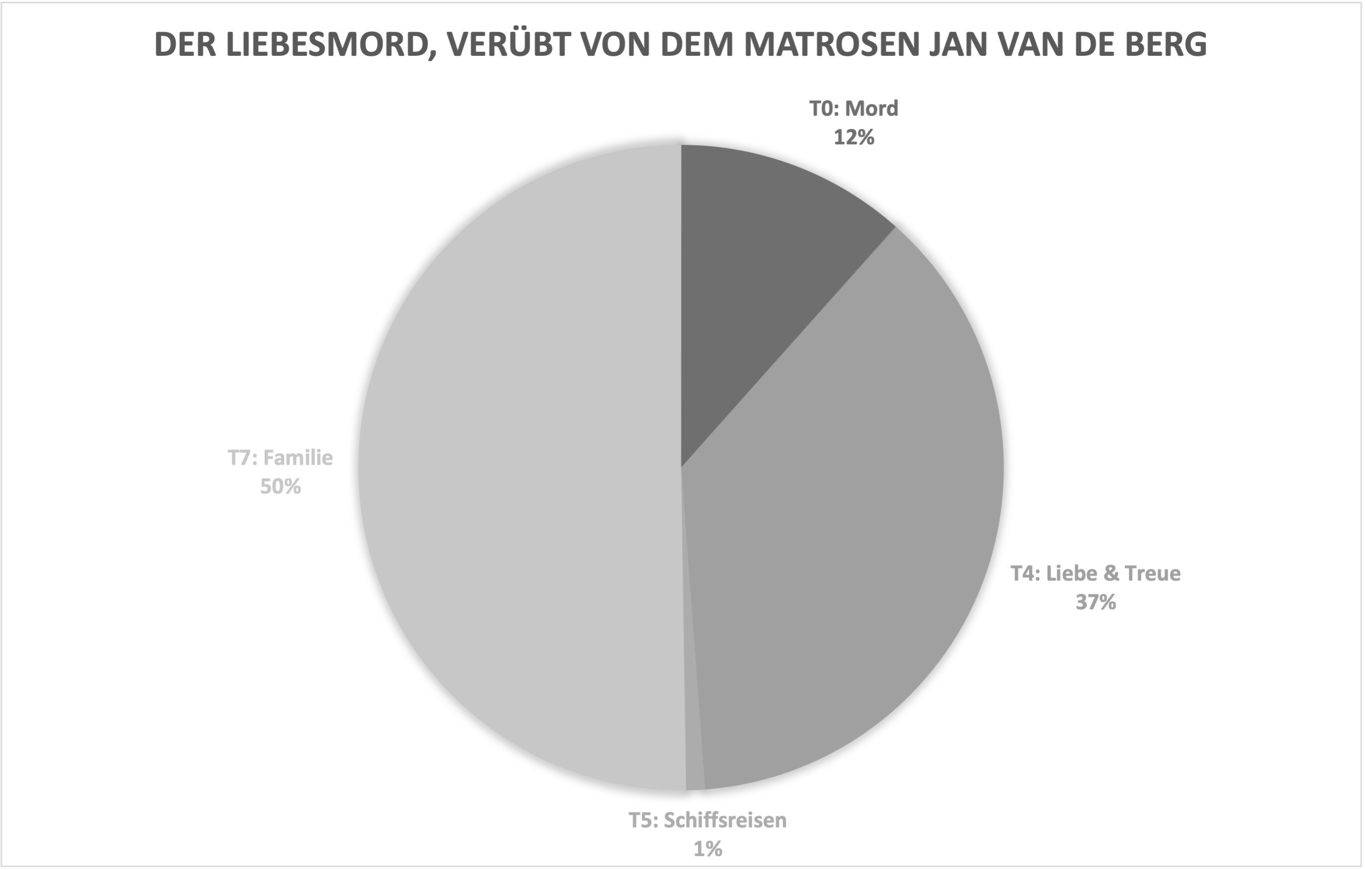 [41]Dass der Explosions-Druck noch einen zweiten Text enthält, der sehr viel informativer berichtet und (nach eigener Aussage) auf einem Zeitungsartikel beruht, ist ein Hinweis darauf, dass sich auch von Unglücksfällen unterschiedlich erzählen lässt.[97] Die Ergebnisse des Topic Modelings enthalten darauf jedoch diesmal keinen Hinweis, anders als etwa bei den Mord- und Verbrechensgeschichten. Die Erwähnung ›unsere(r) Elbe‹ ermöglicht allerdings eine Hypothese zu dem Befund, dass Schiffsunglücke in der Oldenburger Sammlung so prominent vertreten sind: Maritime Themen sind für norddeutsche Leser, aufgrund der Nähe zum Meer, vermutlich interessanter als beispielsweise Erzählungen von Bergwerkskatastrophen, die im Korpus nur einmal zu finden sind.[98] Wie schon bei dem Räuber-Thema, eignet sich das Topic Modeling auch wieder als Suchhilfe. So lassen sich maritime Themen auch dort entdecken, wo sie nur am Rande vorkommen, etwa im schon diskutierten Druck vom Liebesmord, verübt von dem Matrosen Jan van de Berg. Hier attestiert Mallet dem Thema ›Schiffsreisen‹ immerhin 1 % und erweist sich damit als feinfühlig für die Themenmischung des Textes (Abbildung 11), in dem eine Schiffsreise die lange Abwesenheit des Matrosen begründet.