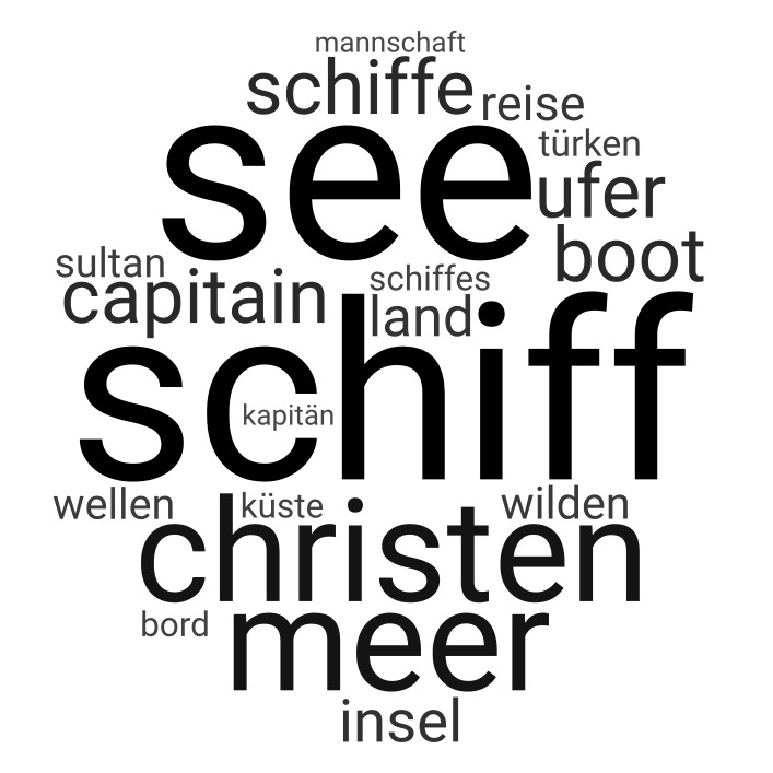 [15]Ich möchte daher einen anderen Vorschlag machen, wie topics im Falle erzählender Texte zu interpretieren sind, wobei ich die deutsche Übersetzung ›Thema‹ beibehalte und zugleich im Rückgriff auf narratologische Begrifflichkeiten präzisiere. An einem Beispiel, das auf die folgenden Analysen von Jahrmarktdrucken vorausgreift, sei dieser Vorschlag kurz erläutert: Zu den topics des Oldenburger Korpus gehört ein topic, das u. a. aus den Wörtern schiff, see, meer, capitain, matrosen, wellen, sturm und reise besteht (Abbildung 4).[53] Auf den ersten Blick ist das kein besonders spannender Befund, wie man mit einem Pionier digitaler Literaturanalyse, Ted Underwood, argumentieren könnte: »As a literary scholar, I find that I learn more from ambiguous topics than I do from straightforwardly semantic ones. When I run into a topic like ›sea‹, ›ship‹, ›boat‹, ›shore‹, ›vessel‹, ›water‹, I shrug. Yes, some books discuss sea travel more than others do.«[54] Bei genauerem Hinsehen lässt sich aus einem solchen ›semantischen‹ topic allerdings doch so einiges lernen. Zunächst einmal liegt es nahe, das Thema als ›Schiffsreise‹ zu bezeichnen, wie es Underwood tut. Die einzelnen Wörter des topics lassen sich zudem unterschiedlichen Kategorien zuordnen: Neben Begriffen, die sich auf Personen beziehen (capitain, matrosen), finden sich Begriffe, die Räume (see, meer) und Naturerscheinungen (wellen, sturm) bezeichnen; das Wort schiff bezeichnet sowohl einen Raum als auch einen Gegenstand. Im Zusammenhang eines narrativen Textes kommen diesen Kategorien jeweils unterschiedliche Funktionen für die Geschichte (histoire) zu, sodass sich die Wortgruppen hier in Figuren, diegetische Räume und Requisiten aufteilen. In Wörtern wie sturm und vor allem reise zeichnen sich zudem Handlungen ab, sodass es naheliegt, solche Wörter als ›Motiv‹ im narratologischen Sinne eines Ereignisses, als »kleinste elementare Einheit der Handlung«,[55] zu deuten.