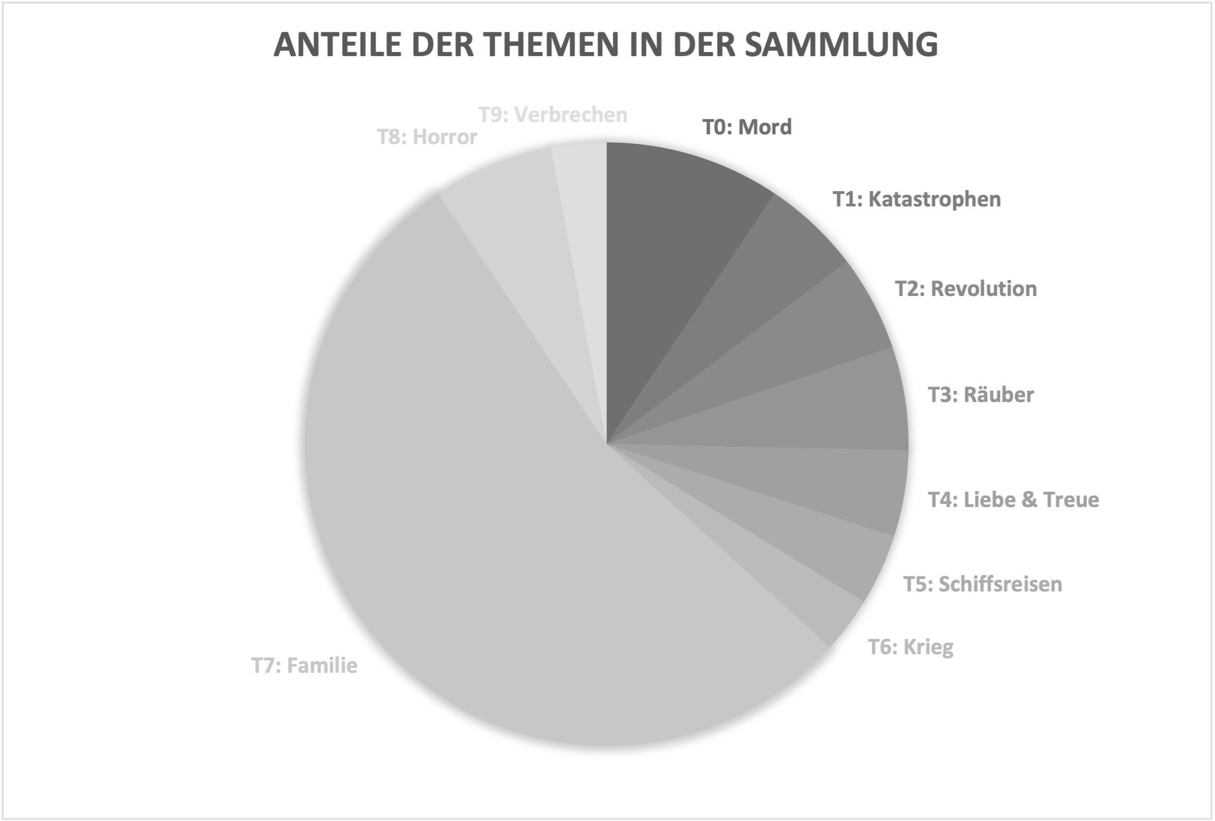 Using topic modeling methods, the article explores a vast spectrum of themes found in ›Jahrmarktdrucke‹ (chapbooks) from nineteenth-century northern Germany. It makes a unique contribution to the study of popular literature through an empirical approach. The texts have been digitized in full, which enables a more precise understanding of the thematic range of this literature than was possible in earlier research on ›Bänkelsang‹. Moreover, the article demonstrates the analytical potential of topic modeling for literary studies by proposing a narratological interpretation: In the chapbooks, topics like murder, sea travel or war, can be understood as specific combinations of narrative building blocks that together constitute the story (histoire).