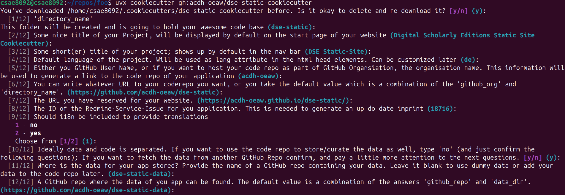 cookiecutter installiert sein. Danach wird mit dem Befehl cookiecutter gh:acdh-oeaw/dse-static-cookiecutter der Initialisierungsprozess einer neuen, auf dse-static-cookiecutter basierten digitalen Edition gestartet. Nun werden ein Dutzend Fragen gestellt, beispielsweise