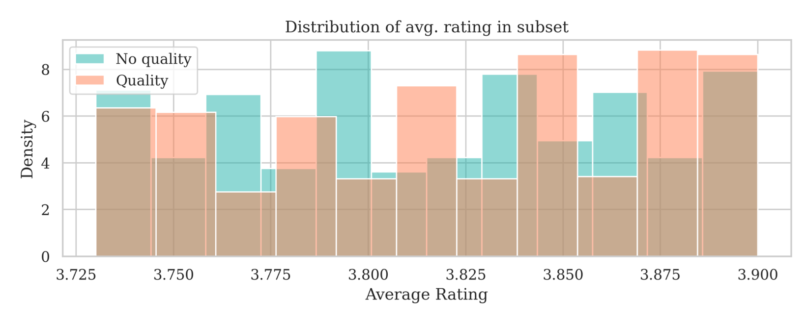 - Table 3: Rating count and standard deviation for the whole corpus, the ›mediocre‹ subset, as well as the quality and non-quality groups.