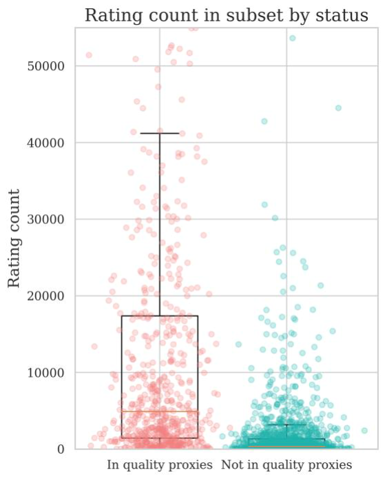 [31]In figure 6, we see that a much larger portion of quality titles place above the subset mean compared to the non-quality group. Still, a considerable part of the ›quality‹ group – approximately ⅓ of the group – does not have a high rating count, indicating works of what we might call ›indecisive quality‹, That is, they are valued highly beyond Goodreads (contained in other quality proxies), but they do not seem to garner much attention on Goodreads, neither in terms of rating nor in terms of higher rating count.