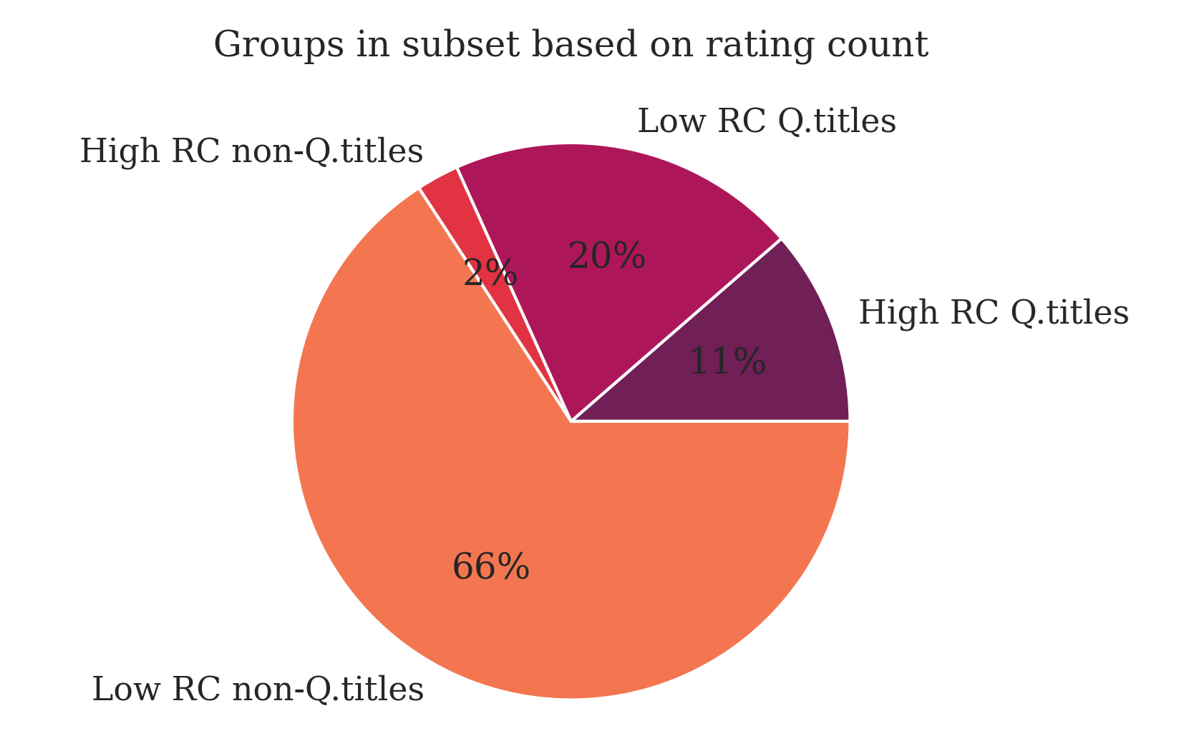 - Figure 6: Pieplot showing the sizes of groups below and above subset mean rating count (RC) within quality and non-quality titles. [Chart: Feldkamp et al. 2025]
